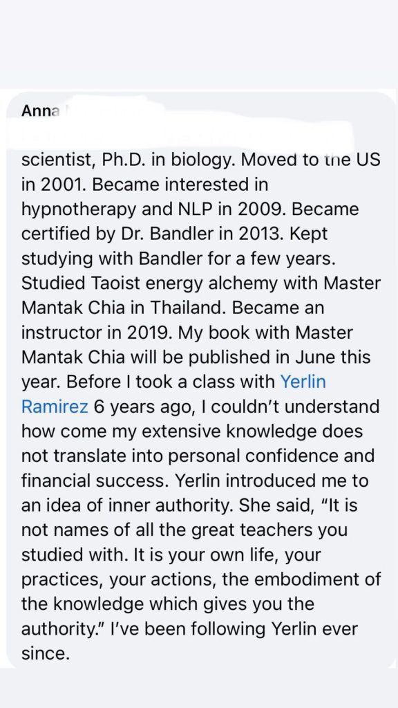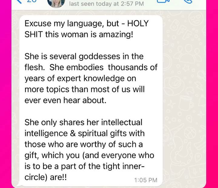 The base of people going from $700 to $40k and from $2000 to a seven figures in their business is not just a strategy that I teach but who I guide people to become. They absorb Deep Wisdom that change them forever so they can show up different in this planet. What I teach is not anything that you will learn In a Law of Attraction book( LOA) they are my own embodied codes and ancient teachings that I am constantly accesing…